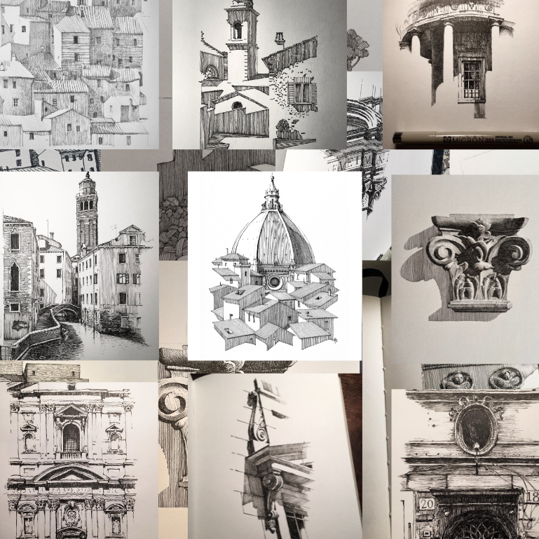 My work focuses on capturing the splendour and detail of urban architecture, both historic and modern. I love the challenge of confining myself to a fine pen, relying on hatching and careful line work to capture light, texture and the essence of a place onto my page.